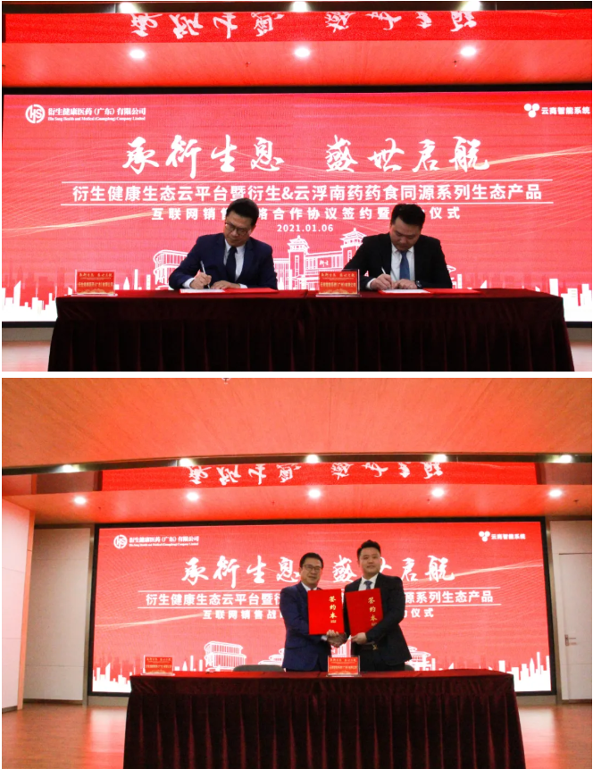 1月6日,衍生健康醫(yī)藥(廣東)有限公司與云商智能系統(tǒng)(廣州)有限公司(源點科技)在衍生健康醫(yī)藥產(chǎn)業(yè)園隆重舉行:衍生健康生態(tài)云平臺暨衍生@云浮南藥藥食同源系列生態(tài)產(chǎn)品互聯(lián)網(wǎng)銷售戰(zhàn)略合作簽約暨啟動儀式 。